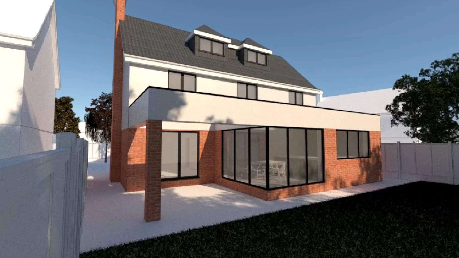The extension replaces an existing conservatory and provides a reconfigured living, kitchen, family space for our client.