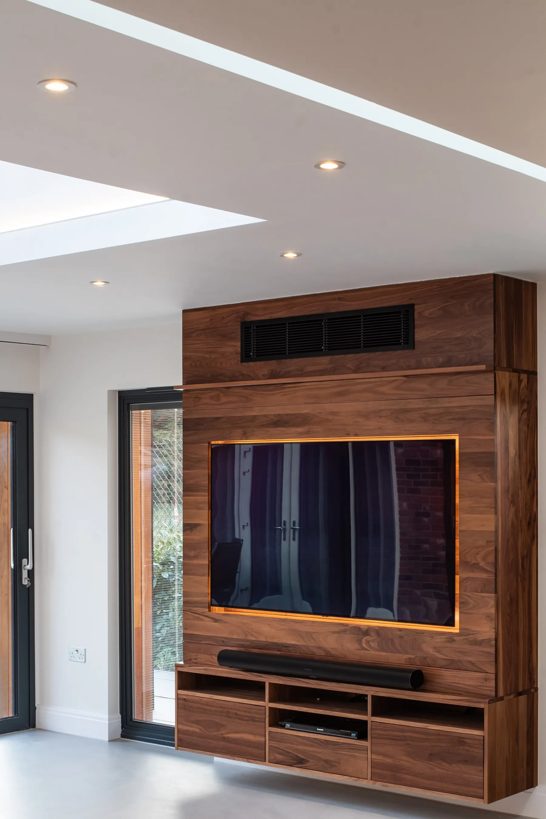 We decided to conceal the unit within the joinery of the feature wall. We designed options and suggested different finishes, including walnut which we felt would offer richness and depth of colour, to add warmth to the family space and offset the exposed brick slips and polished concrete floor.
